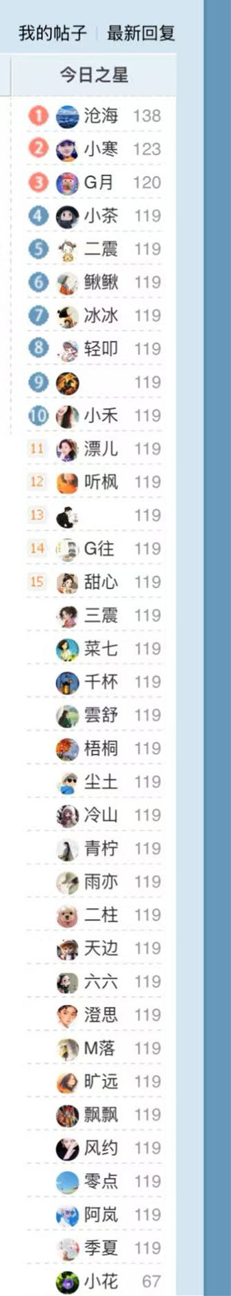 尤其我们119创始人六六,冰冰,一大早独占榜首,小风天没亮就爬起来同步踩楼,感谢所有的角民们!